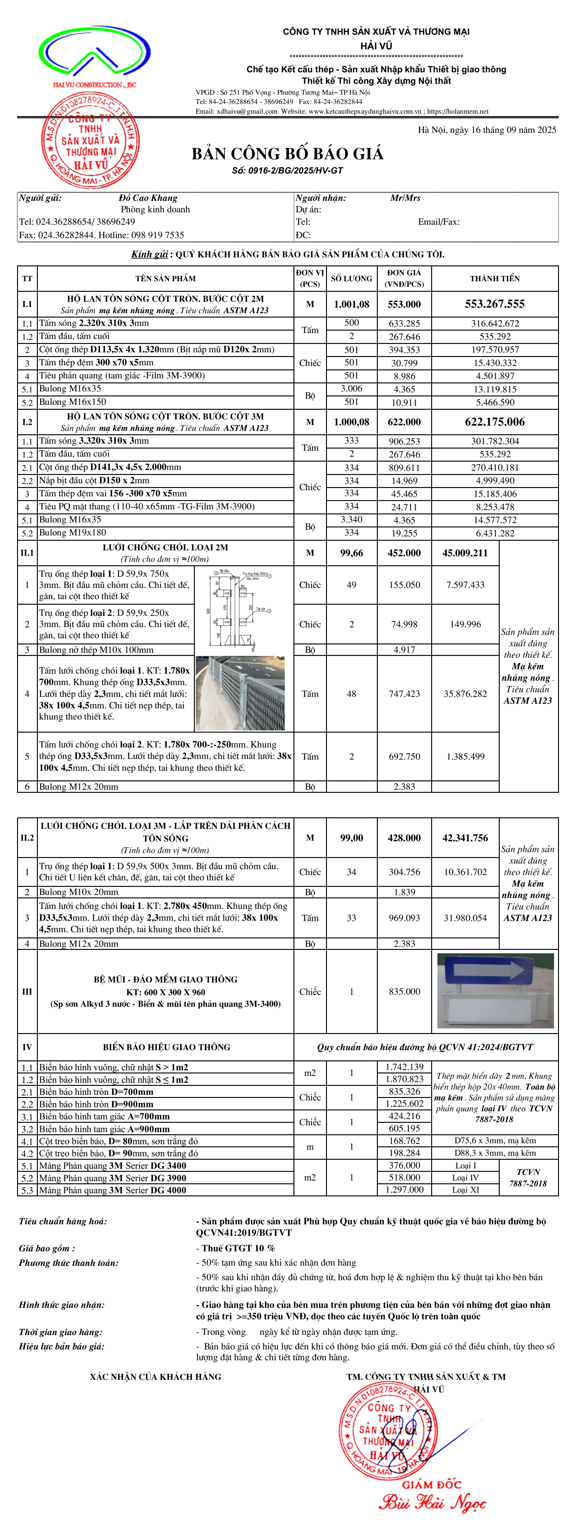 Quý III/2025 -Hai Vu Group –Công bố Báo giá hộ lan mềm cột tròn, lưới chống chói, đảo mềm & báo hiệu giao thông. Quy III.2025 – Bao gia HLM cot tron & luoi chong choi